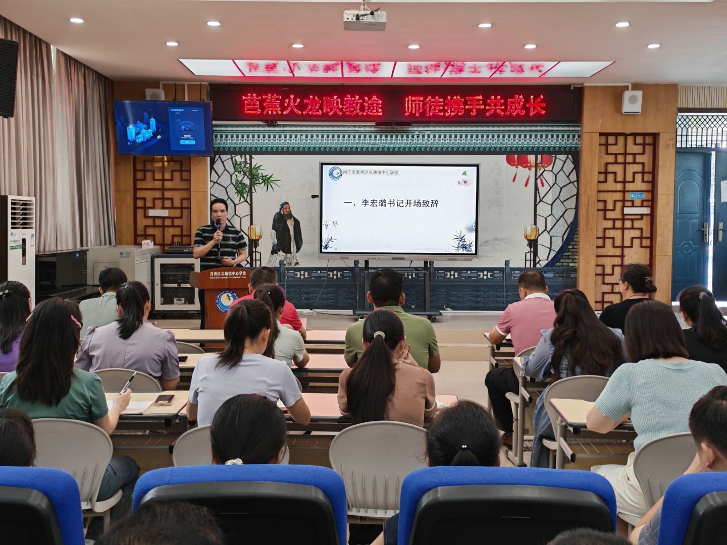 为充分发挥骨干教师的“传、帮、带” 作用,助力青年教师稳健起步、迅速成长,全面提升全镇教师队伍素养与教育教学能力。10 月 9 日下午,南宁市青秀区长塘镇中心学校在一楼多媒体教室举行以 “芭蕉火龙映教途,师徒携手共成长 ”为主题的2025 年秋季学期师徒结对启动仪式。