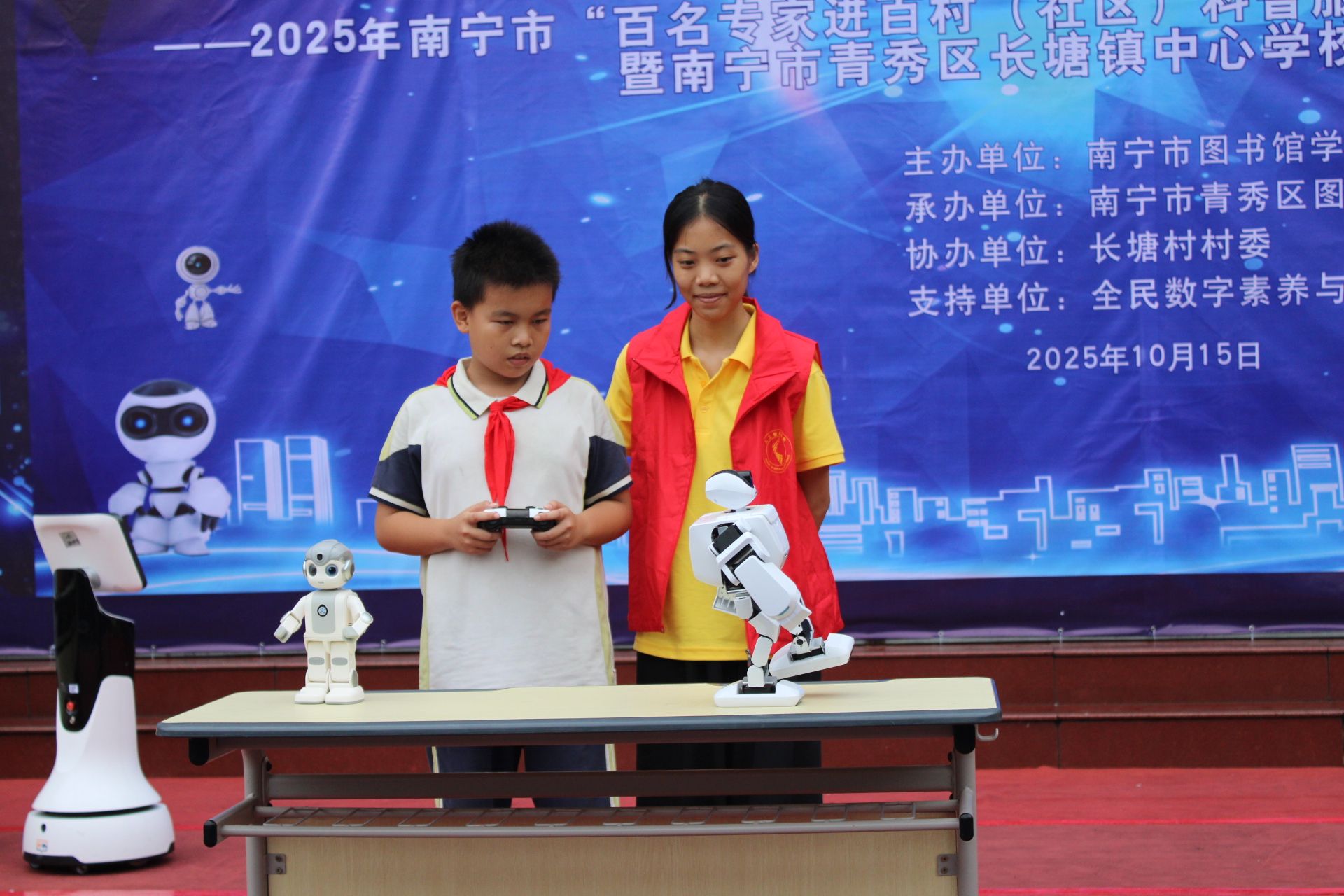 10 月 15 日,南宁市青秀区长塘镇中心学校操场上热闹非凡。以“AI 启智・数字润乡 点亮乡村少年梦”为主题的2025年南宁市“百名专家进百村(社区)科普服务活动”暨南宁市青秀区长塘镇中心学校科技节开幕式启动仪式隆重举行。南宁市图书馆学会、青秀区图书馆、南宁职业技术大学、南宁市青秀区长塘镇便民服务中心、长塘村村委和志愿团队共同参与。在 90 分钟的活动里,乡村孩子们沉浸式触摸 AI 科技,开启了一场奇妙的科学探索之旅。