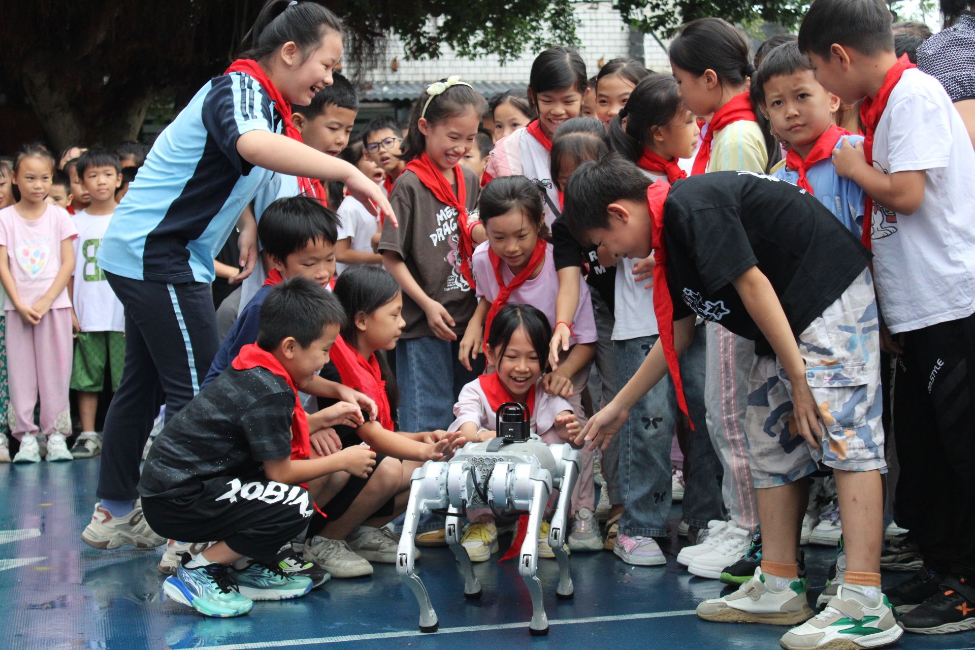 最让孩子们兴奋的当属操场上的“小小的 AI 探索家:动手体验玩转 AI” 环节。AI 机器狗逗趣的动作,引得孩子们欢呼不已;人形机器人不仅能对话互动,还与大家开展“AI 大脑 PK 赛”;水墨屏阅读机前,同学们兴致盎然地阅读里面的内容;VR眼镜体验让同学们恍如身临其境……