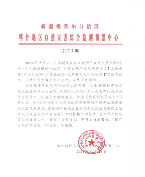 9月23日22时01分,有网民在某互联网平台发布帖文称:“未来1~2个月内新疆喀什地区~克孜勒苏州注意防范6~7【乌恰东部~阿图什北部~伽师县北部~巴楚县西北一线区域】”。