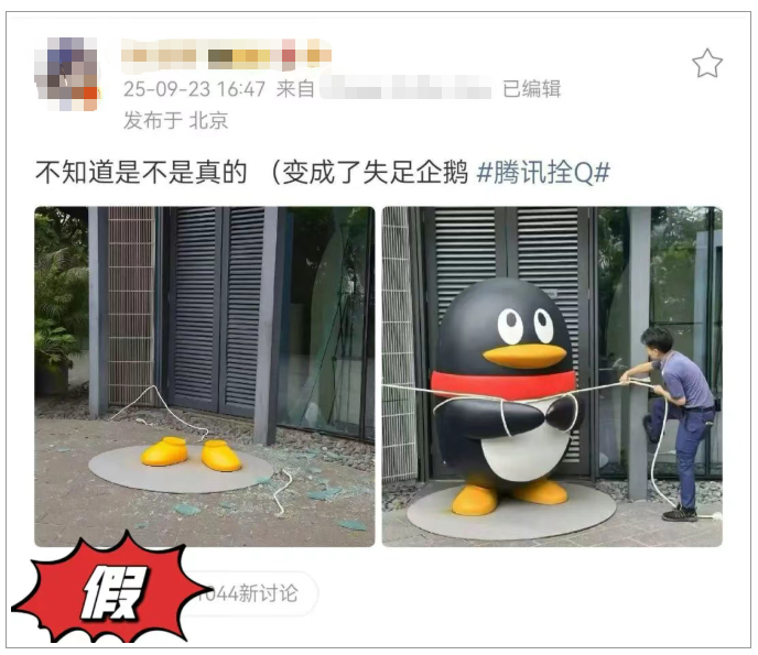 9月23日,腾讯公司为了防御台风,将门口的企鹅用绳拴了起来。而有网民传播的图片显示企鹅只剩双脚,上身被风吹走。腾讯QQ回应:“鹅拴着呢,稳稳的。”