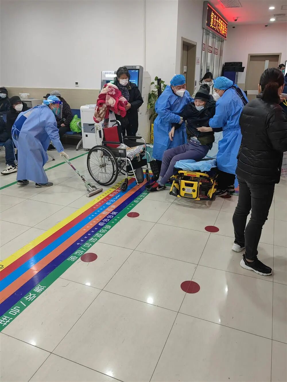 到了医院,他们也会尽量帮患者寻找共享轮椅或推床。12月31日晚,王越接到一位感染新冠的92岁老人。抵达医院后,救护车驾驶员熟门熟路带着家属去门诊大厅借轮椅。“你把手机给我,我帮你扫码。”离开前他还不忘嘱咐一句,“急诊排队人太多,你去发热门诊看。”