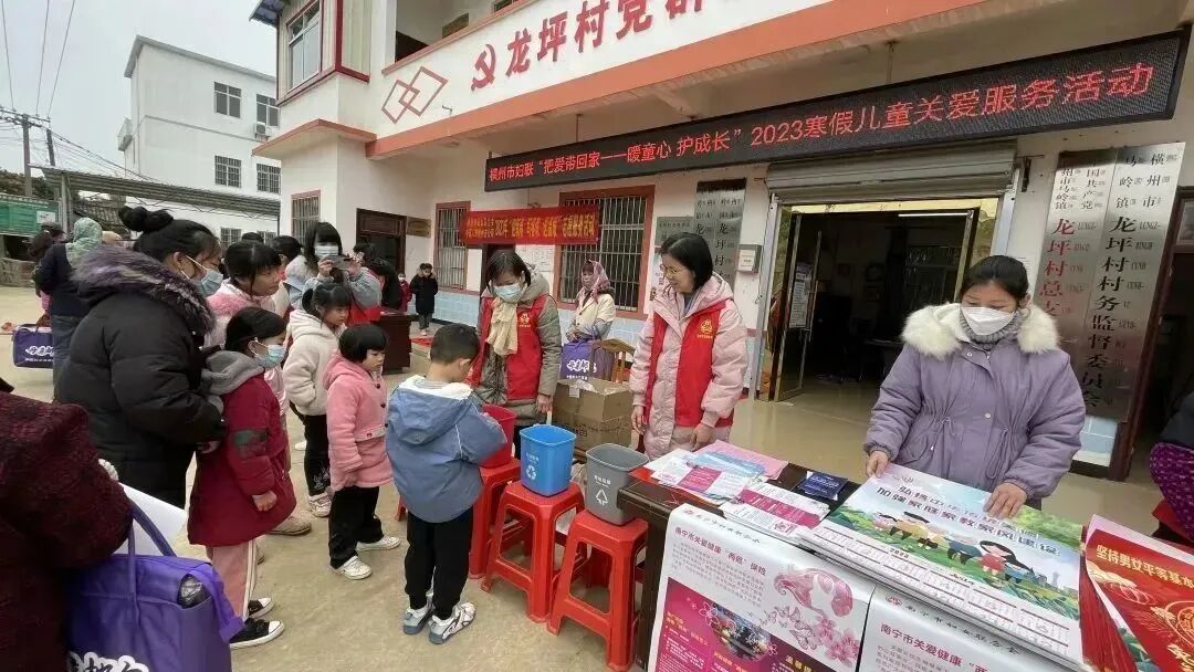 近日,兴宁区妇联、关工委在五塘镇两山村开展“把爱带回家-暖童心护成长”2023年寒假儿童关爱服务活动,慰问留守儿童和困境儿童20人,向孩子们发放兔年历、“福”字、“中华民族一家亲”年画和《家庭教育促进法十问十答》《毒品种类及危害》《应急避险科普知识》等读物,宣传“我们的节日——春节“的习俗文化,普及防疫知识和预防措施、禁毒安全、自救常识、垃圾分类等知识。