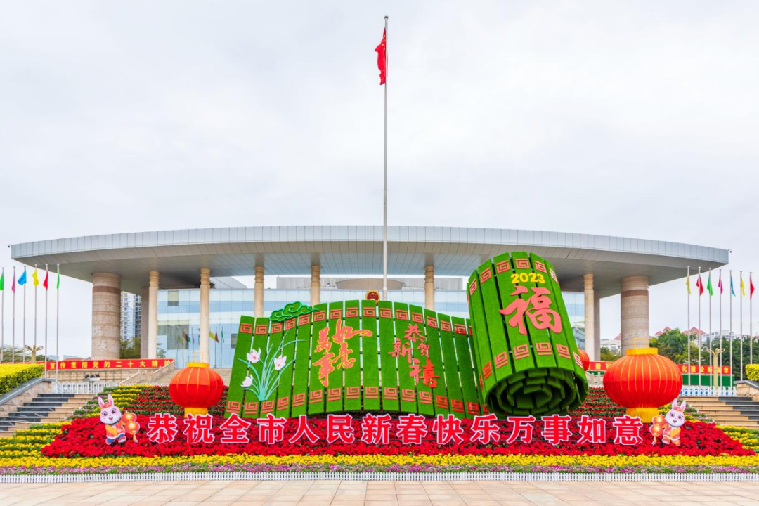 南宁人民会堂前广场精美的“恭贺新喜 万事如意”景观小品造型别致。
