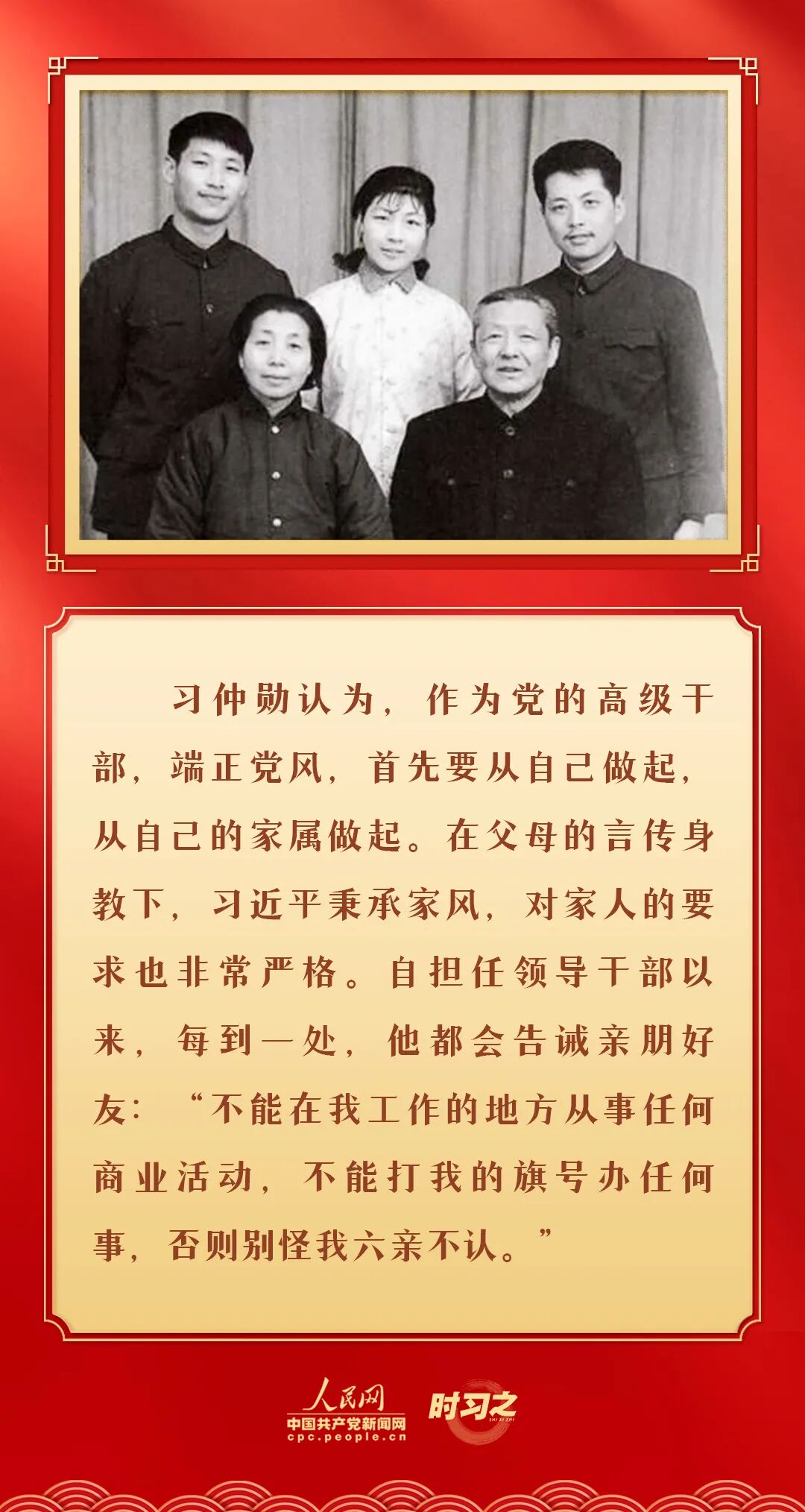 春节,是中华民族最重要的传统节日,饱含着阖家团聚的美满之意,也承载着历久弥新的家国情。天下之本在国,国之本在家。正是家庭这个“人生的第一所学校”,塑造了习近平的家国情怀,成为他修身齐家治国理政的信念源泉。新春佳节来临,一起回顾习近平的家风故事,感悟以家风涵养初心使命。