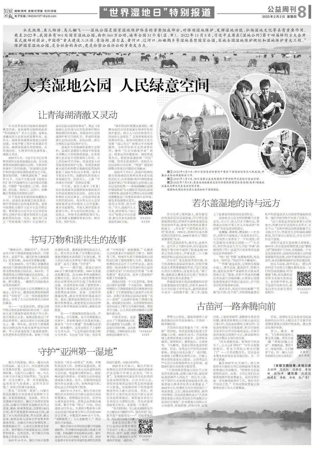 湿地和森林、海洋是地球三大生态系统。作为“地球之肾”,湿地在涵养水源、净化水质、蓄洪抗旱、调节气候和维护生物多样性等方面发挥着重要功能,是重要的自然生态系统,也是自然生态空间的重要组成部分。中国湿地面积6600万公顷,占世界湿地的10%,位居亚洲第一、世界第四。党的十八大以来,习近平总书记多次强调湿地的重要性,对湿地的保护和恢复一直牵挂于心。2022年6月,湿地保护法开始施行。2022年10月,党的二十大报告提出“推行草原森林河流湖泊湿地休养生息”。珍爱湿地,就是守护人类的美好未来。今天,恰逢第27个世界湿地日,主题为“湿地修复”,《检察日报 公益周刊》策划推出“世界湿地日”特别报道,聚焦检察机关作为公共利益的代表,在守护大美湿地中的积极作为。