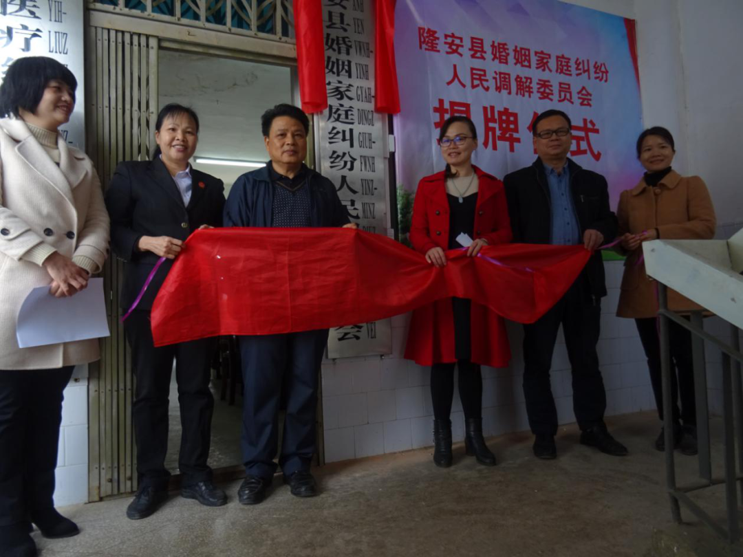 隆安县婚姻家庭纠纷人民调解委员会在县城举行,婚调委成员单位负责人一起揭牌。