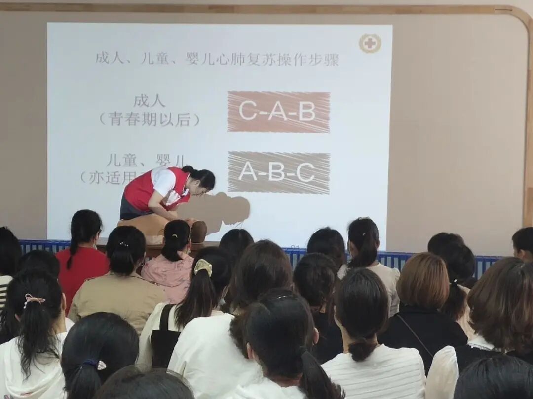 培训师还以近年来发生在其他幼儿园的鲜活事例,通过播放幻灯片和视频、展示实物、现场演示等形式,向教职工讲解关于气道异物梗阻、海姆立克、心肺复苏(CPR)等相关应急救知识,强调了应急救护“黄金四分钟”的重要性。以模拟橡胶人和AED模拟机为器具,现场演示了正确的心肺复苏+AED的操作方法,并侧重了幼儿的急救方法。