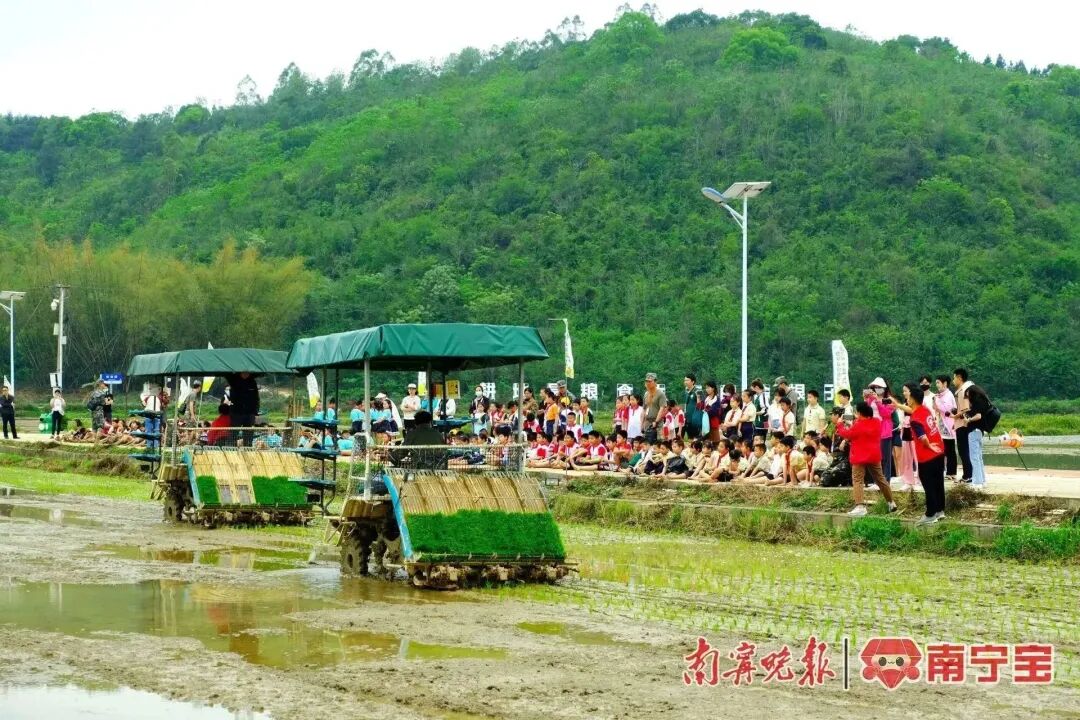 中国—东盟稻作文化园是青秀区重点建设的乡村振兴产业示范区。该园区是由广西力拓米业集团有限公司打造的以优质水稻作为主导产业,集智慧生态农业、科普教育、农耕体验、观光旅游、休闲娱乐于一体的“农业公园”。力拓米业有机水稻基地积极探索文旅融合发展新模式,不断挖掘特色文化旅游内涵,打造特色研学实践基地。当天,工作人员还演示了水稻插秧机的如何工作。学生们排排坐在稻田边,近距离感受智慧农业的魅力。“市民们可以到力拓水稻公园参加插秧、收割,感受智慧农业等活动,体验传统农耕乐趣,同时探索现代智慧农业。”该公司农旅部经理陈霞介绍。