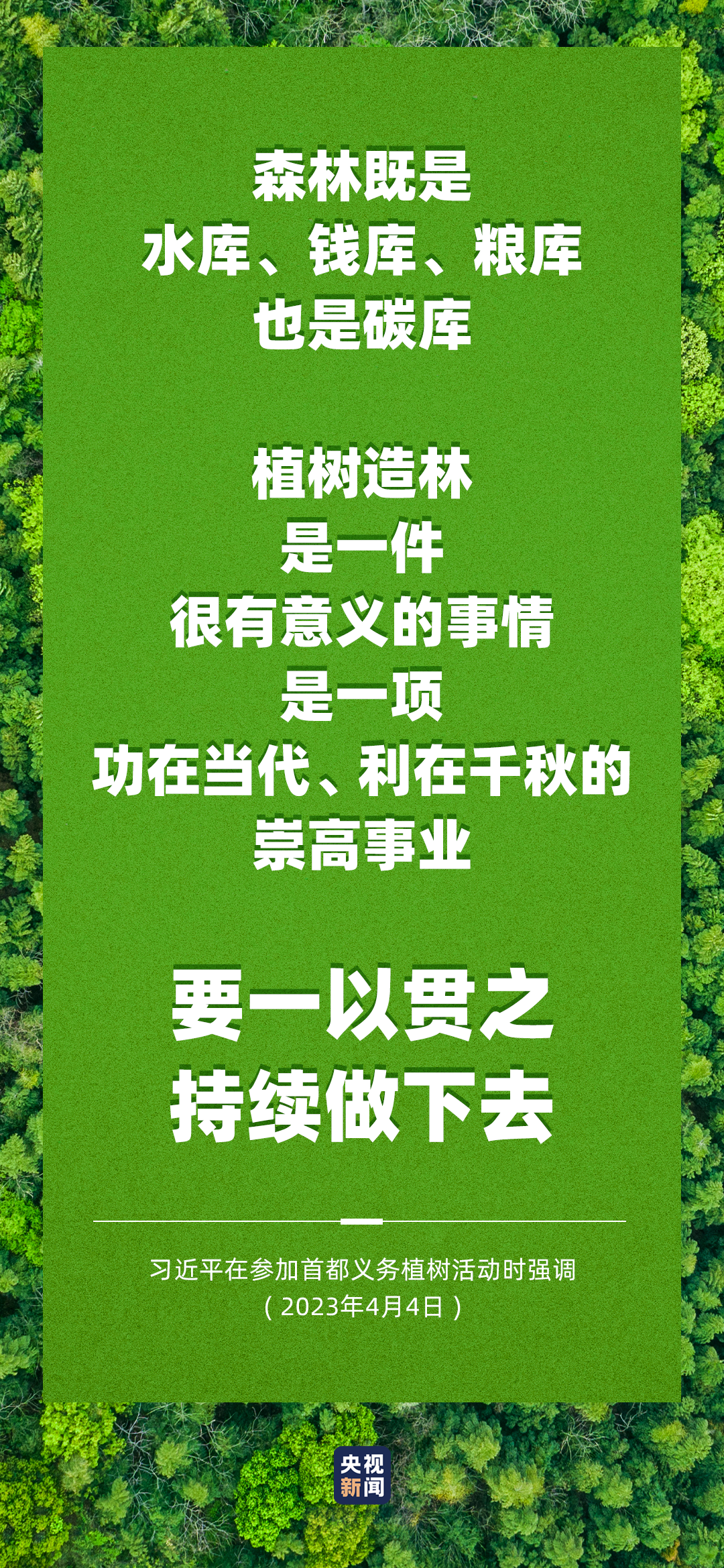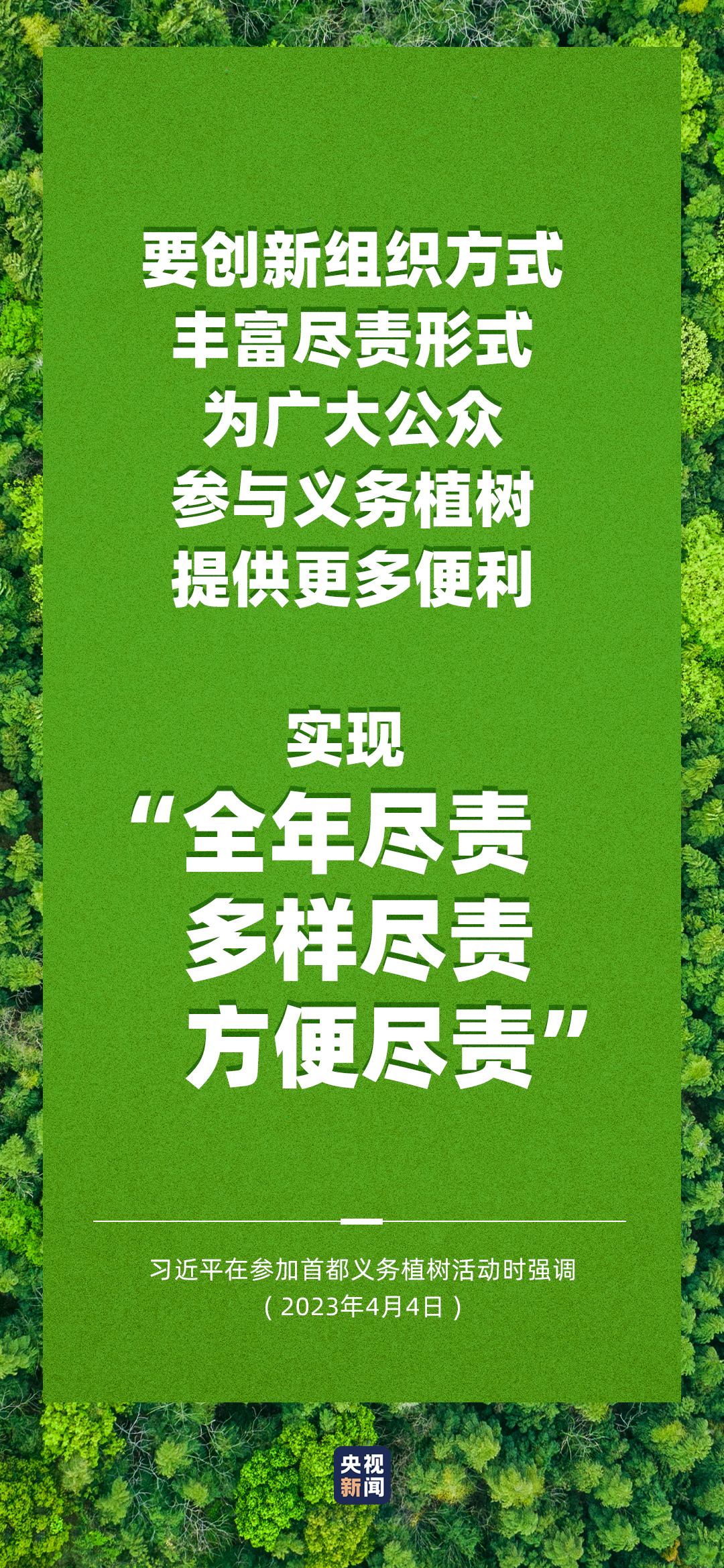 习近平强调,当前和今后一个时期,绿色发展是我国发展的重大战略。开展全民义务植树是推进国土绿化、建设美丽中国的生动实践。各地区各部门都要结合实际,组织开展义务植树。要创新组织方式、丰富尽责形式,为广大公众参与义务植树提供更多便利,实现“全年尽责、多样尽责、方便尽责”。让我们积极行动起来,从种树开始,种出属于大家的绿水青山和金山银山,绘出美丽中国的更新画卷。