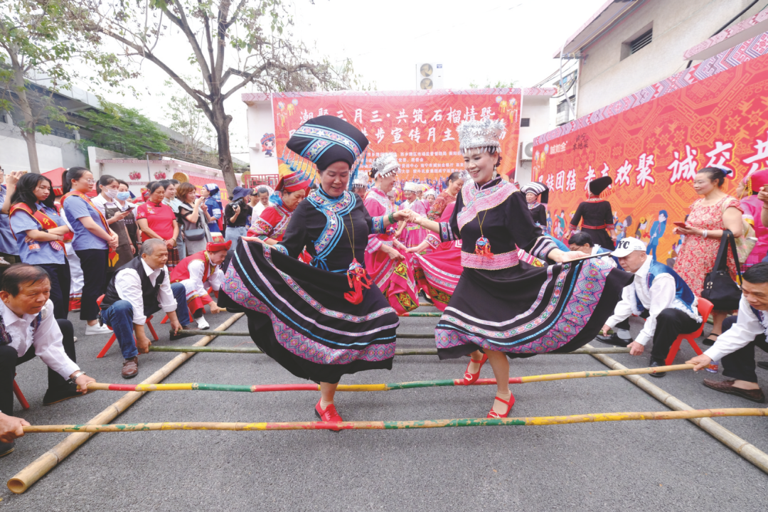 现场,壮族群众用五色糯米饭,西北少数民族群众用葡萄干、大枣等特产摆出“潮聚三月三·共筑石榴情”等字样,体现了民族团结一家亲,烘托出浓厚的节日气氛,吸引各族群众纷纷围观、打卡拍照。在民族传统体育活动跳竹竿舞环节,伴随着欢快的节奏,各族群众手牵手,共跳竹竿舞、共筑民族情,现场一片欢声笑语。