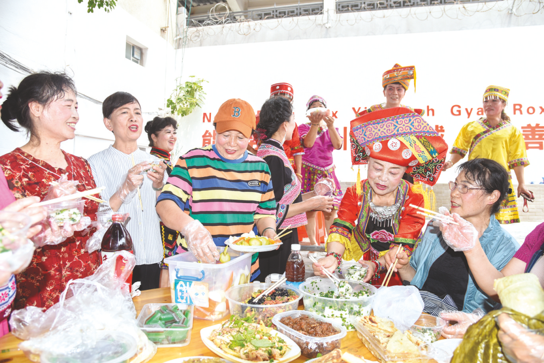 “压轴好戏”百家宴更是将活动推向高潮。从民族团结巷小区一直到同心文化广场,摆放60余桌,吃席人数约600人。各族群众带上手撕鸡、越南春卷、糖醋排骨、白切鸡、烤馕饼、手抓羊肉饭等自家的美味佳肴,香气扑鼻而来,大家一边品尝美食,一边相互交流烹饪经验,拉近了邻里关系。