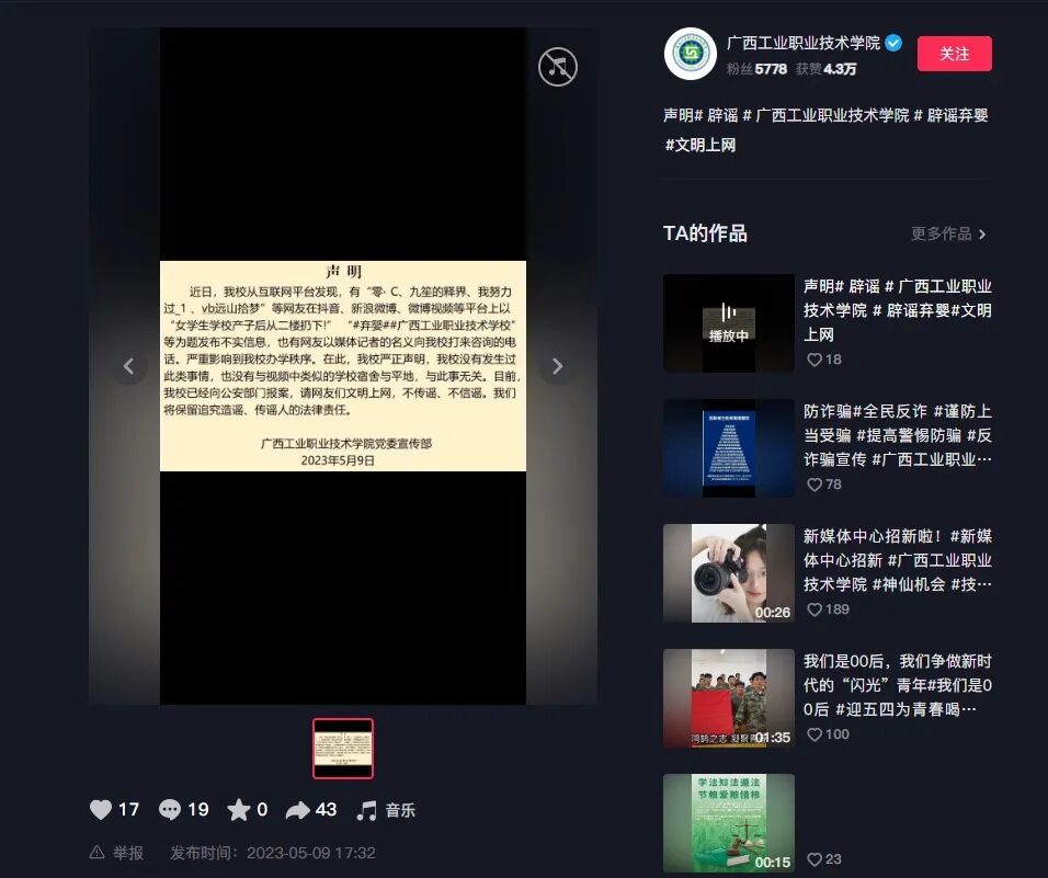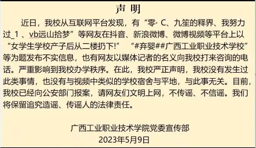 5月9日,广西工业职业技术学院发布官方声明,称该校未发生过此类事件,网传图片和信息均不是发生在该校。针对此不实信息,学校已向公安机关报案。