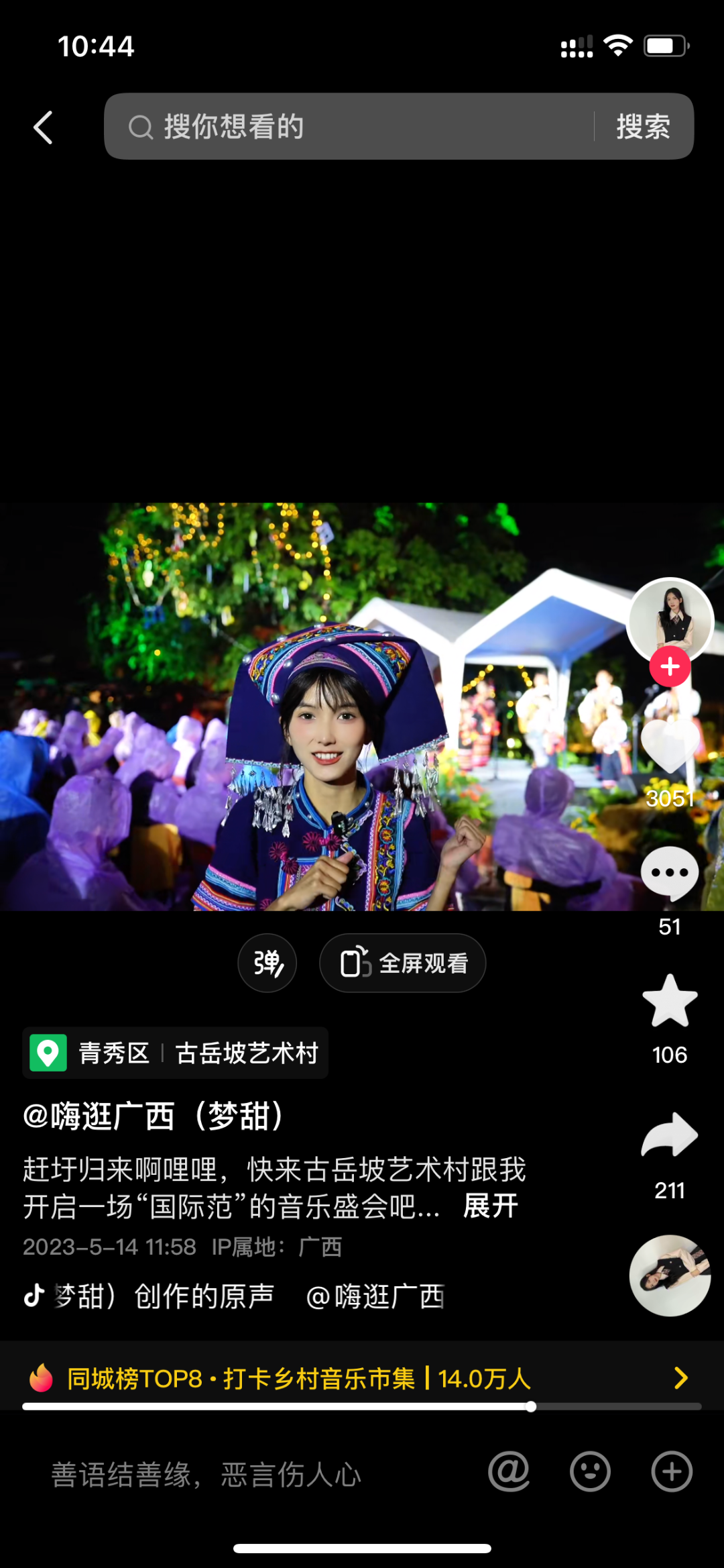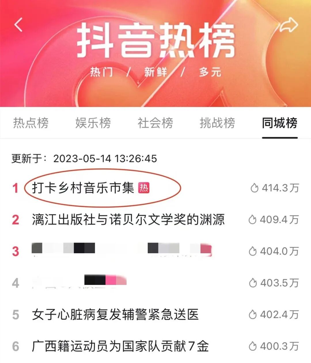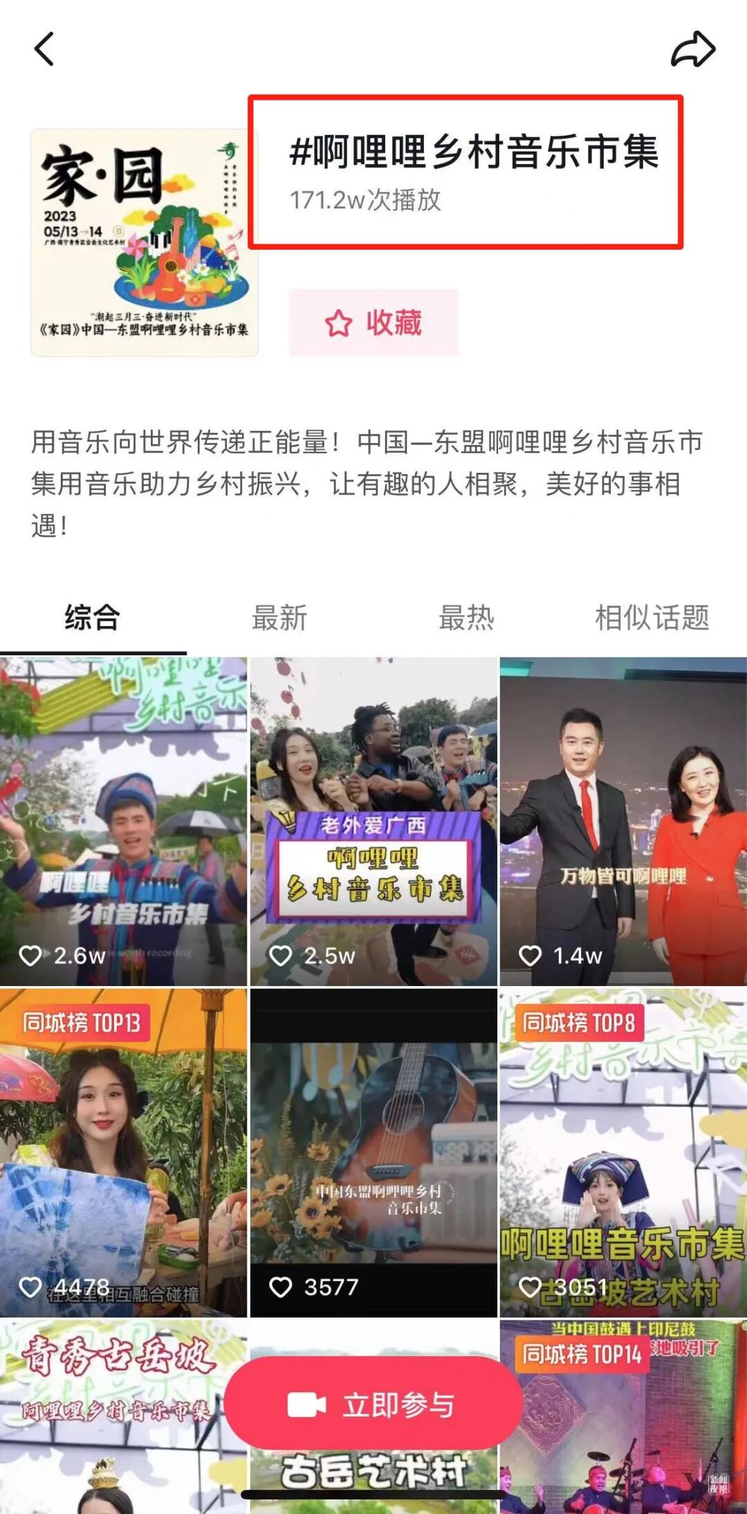活动不仅在线下得到了广大市民的热情参与,线上也是话题度满满,抖音话题#打卡乡村音乐市集#登上南宁同城热榜第一️,关注热度达414.3W。#啊哩哩乡村音乐市集#活动话题吸引众多达人来参与创作,总播放量达171.2W。