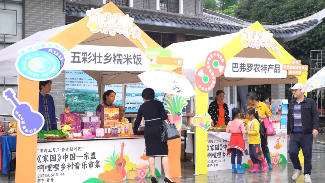 “潮起三月三·奋进新时代”《家园》中国—东盟啊哩哩乡村音乐市集活动人山人海,热闹非凡。市集不仅有传统夜市小吃,还可以沉浸式享受国内外丰富音乐与在地特色美食、非遗体验。