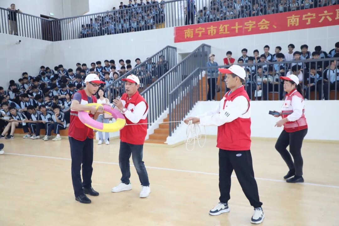 活动现场,志愿服务队向师生讲解演示了防溺水互救、人工呼吸、心肺复苏、海姆立克急救法等救护技能的步骤和要领,并邀请学生进行实操练习。在演练过程中,志愿者老师对上场体验的学生悉心指导并及时纠错,使同学们掌握了应急救护要点。在体育馆的高一师生以及在教室的高二师生、高职部师生通过观摩学习和收看直播,了解了基本的防溺水急救知识和技能。培训的最后,学校领导为南宁市红十字会应急救护志愿服务队赠送了锦旗。