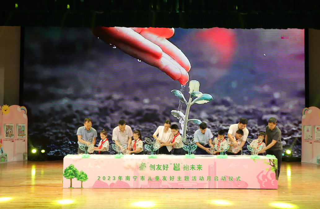 与会领导为南宁市少年儿童代表赠送“六一”礼物,并与儿童代表一起浇灌点亮“儿童友好树”,启动“‘童’创友好 ‘邕’抱未来”2023年儿童友好主题活动月活动,为南宁市儿童友好城市建设按下“加速键”。
