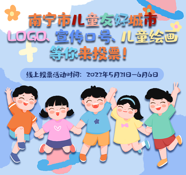5月31日,南宁市儿童友好城市LOGO、宣传口号、儿童绘画作品网络投票正式开始啦!快来给你喜爱的南宁市儿童友好城市LOGO、宣传口号、儿童绘画作品投票吧!