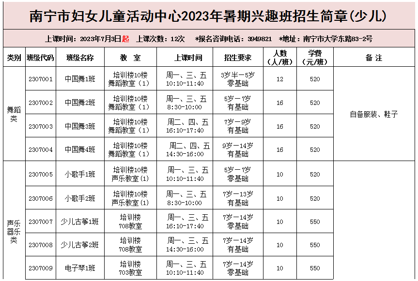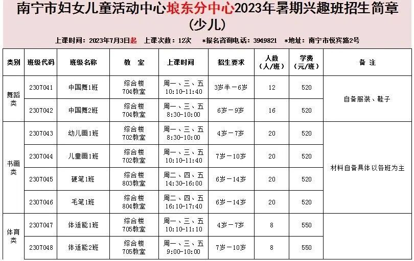 为了满足广大儿童、青少年、妇女各类群体的学习需求,南宁市妇女儿童活动中心、南宁市妇女儿童活动中心埌东分中心2023年暑期各类培训班现已开始接受报名。