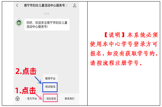 2.在服务号下方点击菜单“招生报名”,在二级菜单中选择“培训报名”。