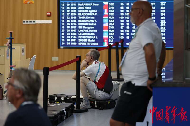 8月1日,四川成都,成都大运会男子10米气手枪决赛上,教练员在场边关注比赛情况。中青报·中青网记者 赵迪/摄