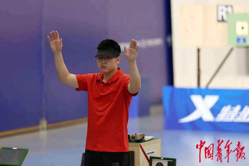 8月1日,四川成都,成都大运会男子10米气手枪决赛上,中国选手胡凯挥手致意。在高手如云的比赛中,胡凯发挥稳定,以240.4环的成绩突出重围,夺得金牌。中青报·中青网记者 赵迪/摄