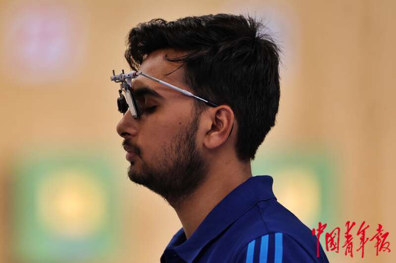 8月1日,四川成都,成都大运会男子10米气手枪决赛上,印度选手在比赛中。中青报·中青网记者 赵迪/摄