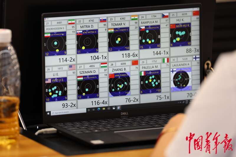 8月1日,四川成都,成都大运会男子10米气手枪决赛上,现场一块电脑屏幕上显示着各国选手的成绩。中青报·中青网记者 赵迪/摄