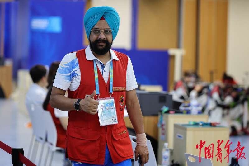 8月1日,四川成都,成都大运会女子50米步枪三种姿势团体决赛上,一名来自印度的裁判。中青报·中青网记者 赵迪/摄