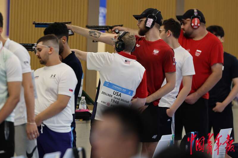 8月1日,四川成都,成都大运会男子10米气手枪决赛上,各国选手在比赛中。中青报·中青网记者 赵迪/摄