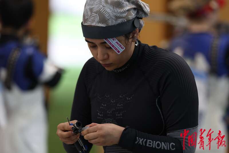 8月1日,四川成都,成都大运会女子50米步枪三种姿势团体决赛上,伊朗选手在比赛中。中青报·中青网记者 赵迪/摄