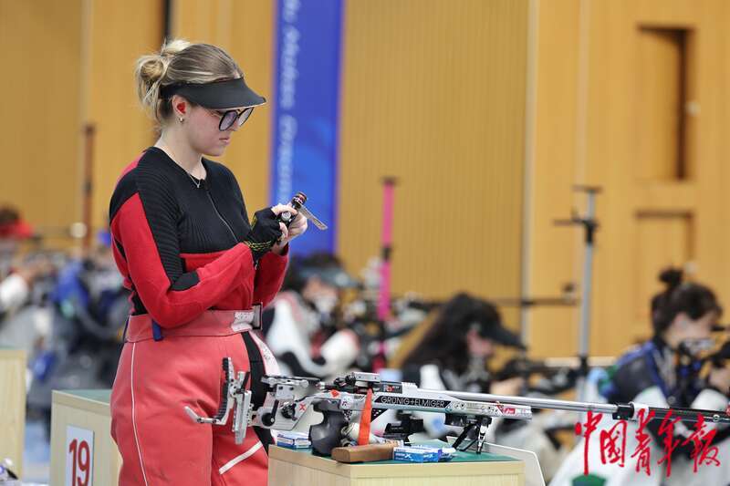 8月1日,四川成都,成都大运会女子50米步枪三种姿势团体决赛上,一名外国选手在比赛中。中青报·中青网记者 赵迪/摄