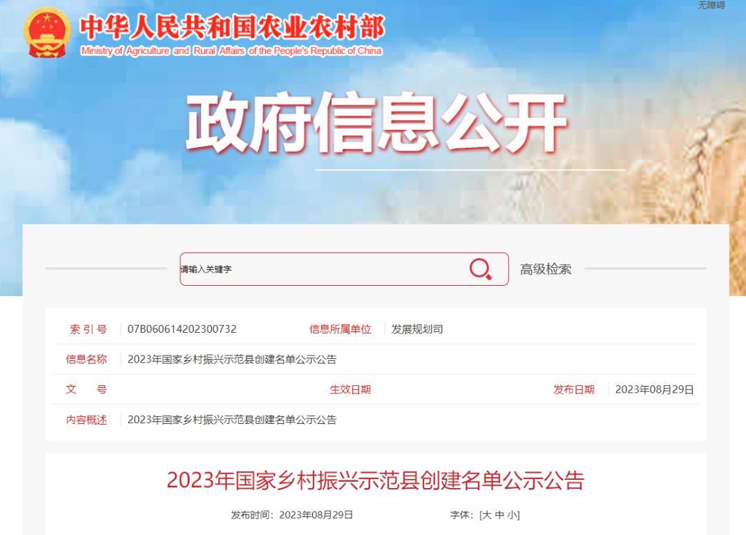 《2023年国家乡村振兴示范县创建名单