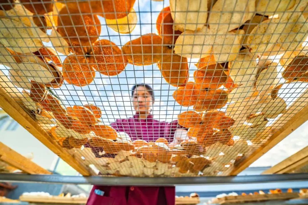 工人正在查看晾晒中的柑橘皮。图源:钦州发布