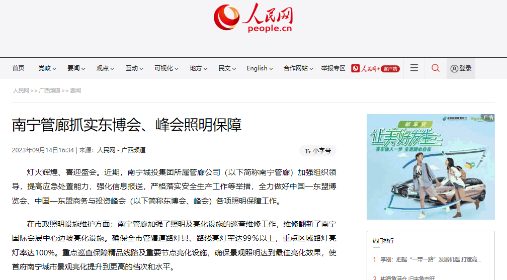 在市政照明设施应急保障方面:南宁管廊加强自然灾害防范应对工作,完善应急预案,配备应急保障物资,成立以青年党员为主的应急保障队伍,负责处理东博会、峰会期间发生的应急照明设施抢修工作,保证设施完好、安全可靠,确保各项活动顺利进行。(吴昌优、吴彤)