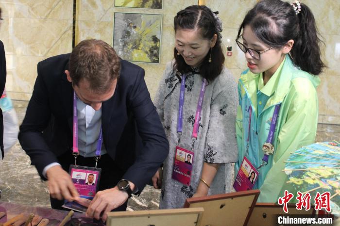 在工作人员和志愿者介绍下,外宾体验中国非遗文化。沈冰 摄