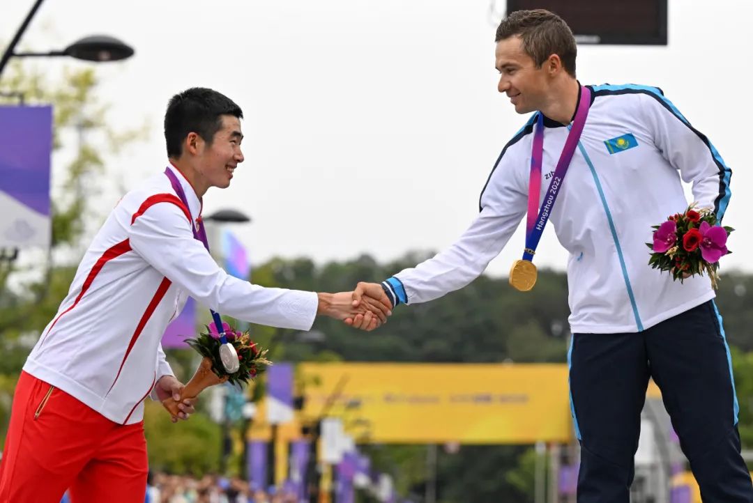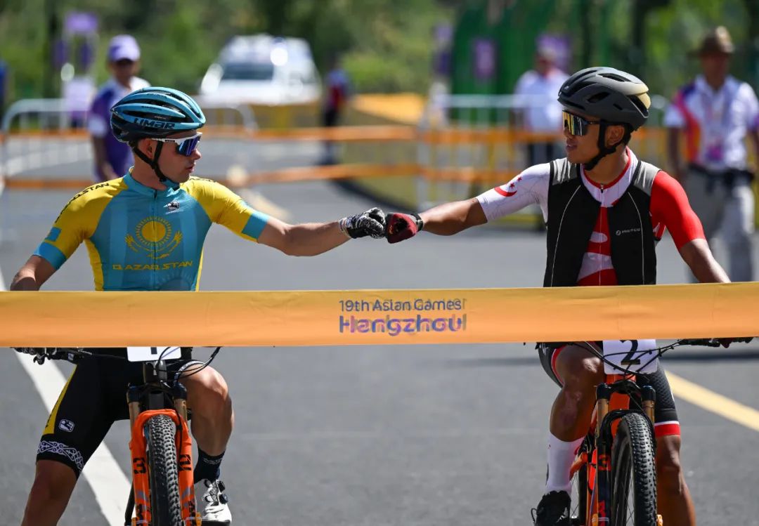 哈萨克斯坦选手丹尼斯·谢尔吉延科(左)和新加坡选手宾·卢克曼·里亚德·哈基姆出发前相互致意