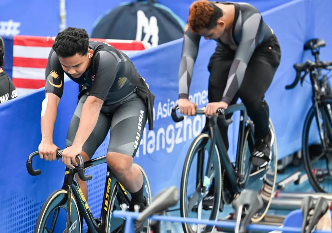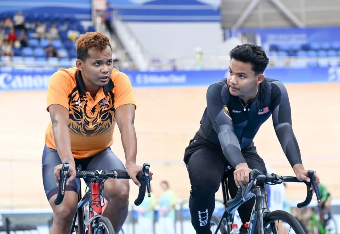 马来西亚车手穆罕默德·里德万·本·萨赫鲁姆(右)与哥哥穆罕默德·沙阿·菲尔道斯·本·萨赫鲁姆一起热身。