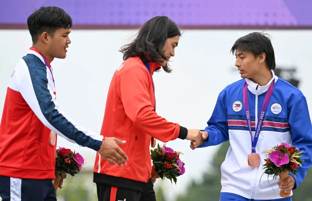 日本选手中井飞马(中)、泰国选手戈梅·素巴社(左) 、菲律宾选手帕特里克·布伦·库在颁奖仪式上握手