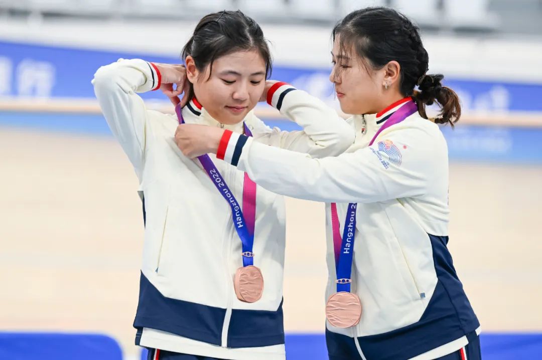 中国香港队选手梁宝仪(右)在颁奖仪式上帮助妹妹梁颖仪整理奖牌绶带