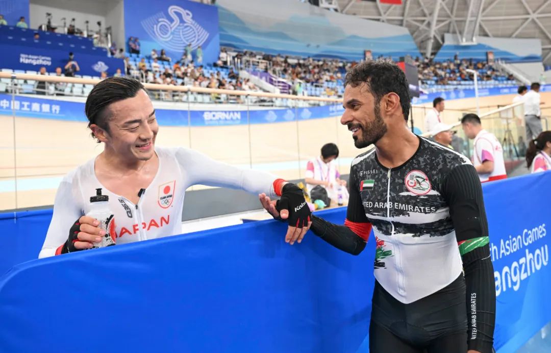 日本选手窪木一茂(左)和阿联酋选手艾哈迈德·曼苏里赛后交流