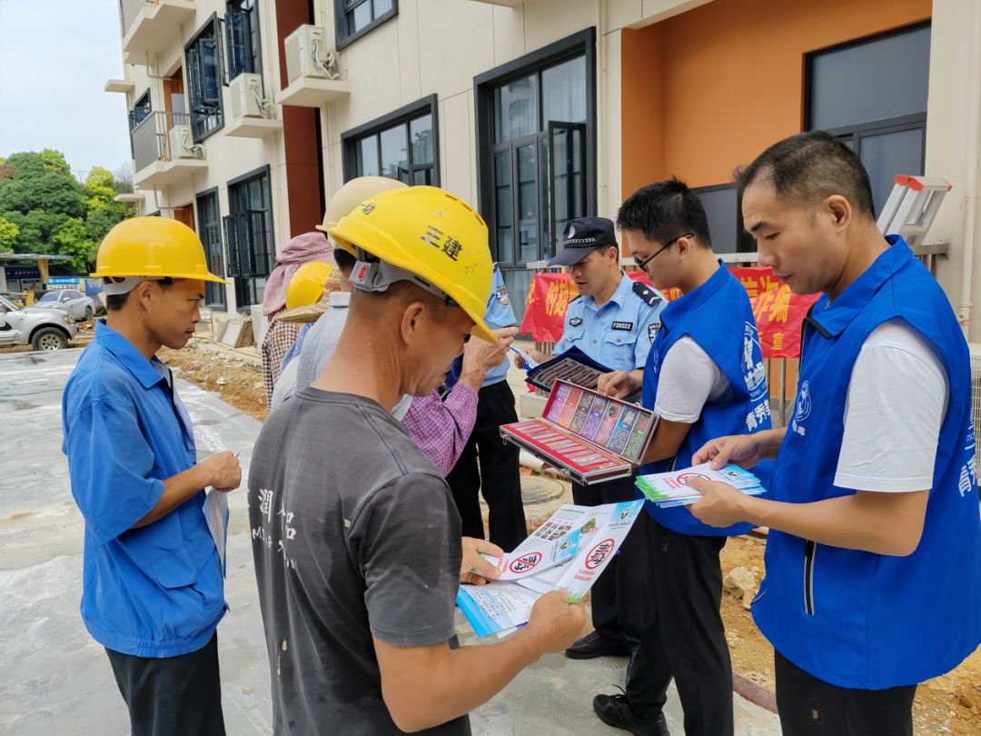 青秀区禁毒办、中山街道社区戒毒(康复)工作站联合中山派出所民警深入南宁市青秀区直属机关幼儿园工地开展禁毒宣传普法教育。由于工地工作的特殊性,且大部分工友对毒品危害知之甚少,禁毒工作人员通过发放禁毒知识宣传手册、禁毒仿真模型展示向他们介绍了毒品的种类、禁毒相关法律法规,呼吁他们要远离声色场所,切实增强毒品辨识度及警惕性,全力筑牢禁毒思想防线。