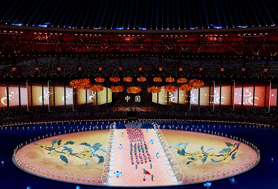Twenty-two massive bouquets of golden osmanthus, which represent the 22 sports featured in the event, served as the centerpiece of the ceremony.