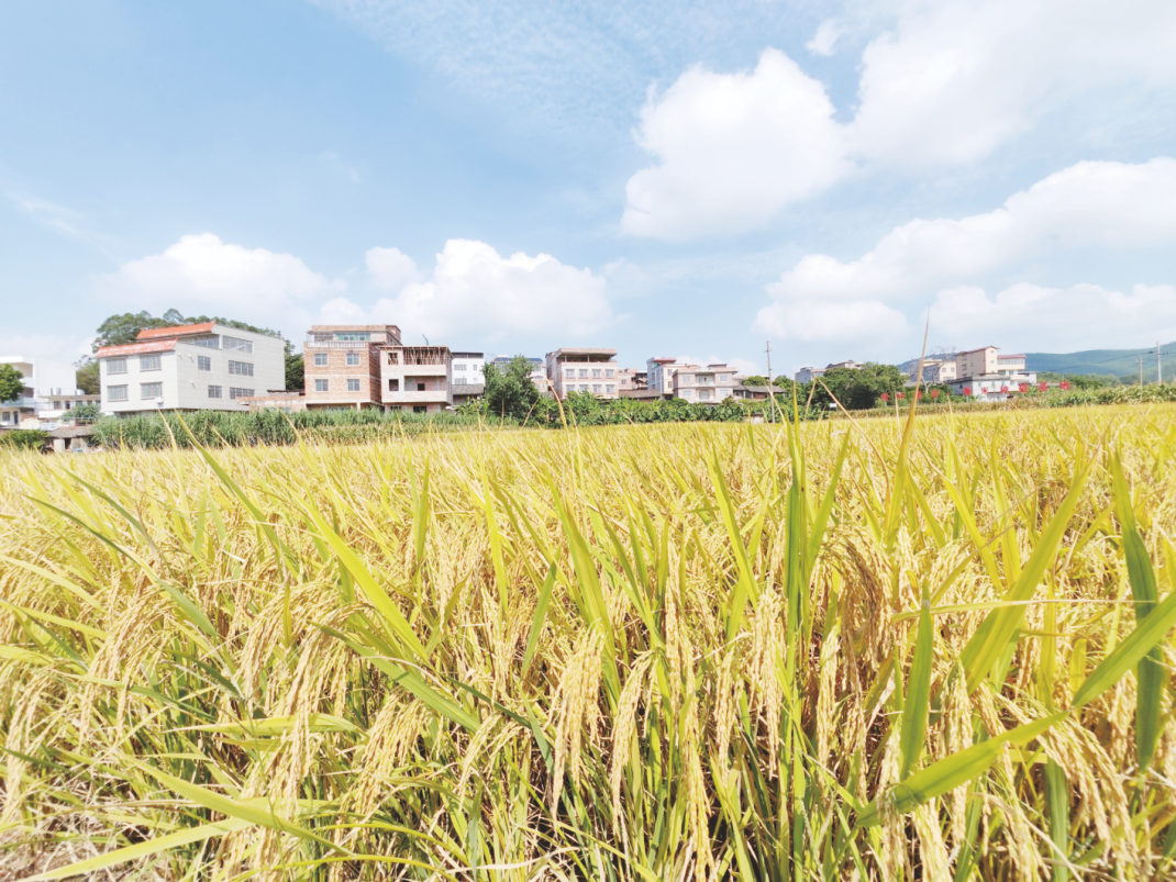 青秀区刘圩镇麓阳村晚稻迎来丰收,稻田和民房形成美丽的乡村风景