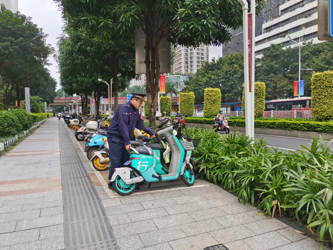 青秀区城管局中山大队处理民族大道共享单车乱停放。