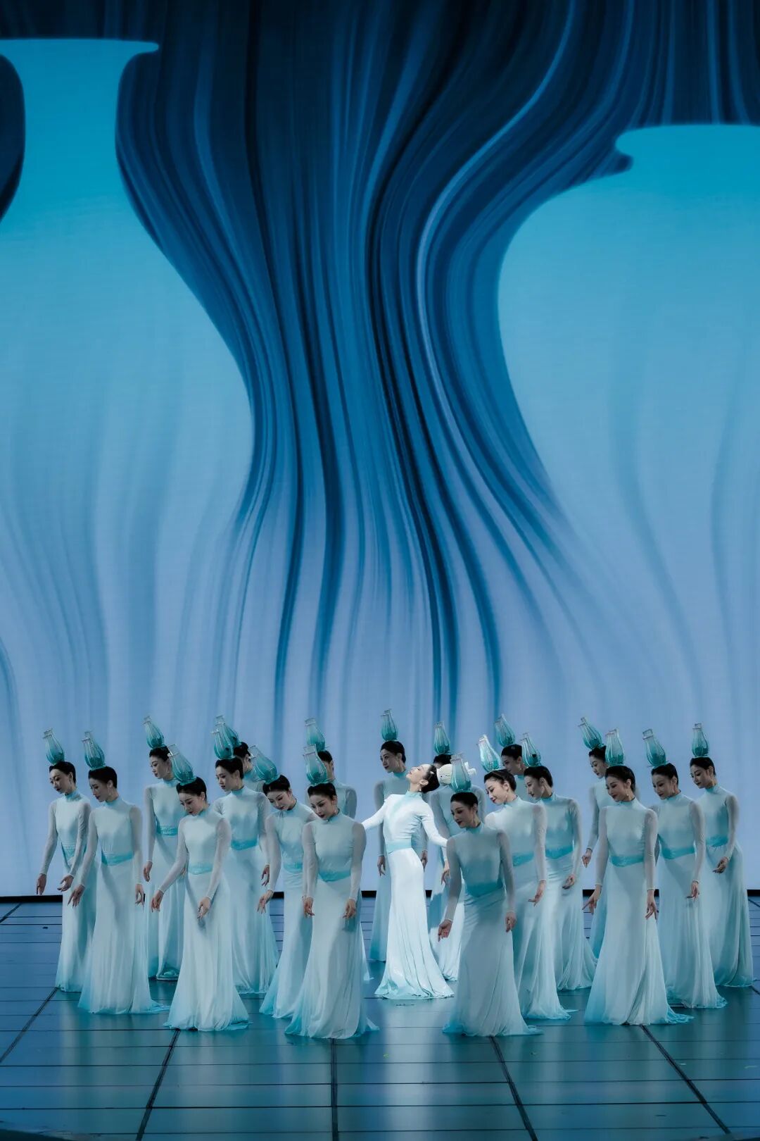 《瓷影》正是以青白瓷为视觉出发点,演出服装在色彩上着墨,提取“青”“白”这两种传统“正色”,展现出大繁若简的东方美学。通过舞者的肢体语言展现青白瓷跨越千年的独特魅力。