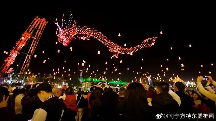 晚上,2000架无人机点亮南宁夜空,无人机方队变身超级巨龙、神凤飞天,以及壮美广西的美丽画卷,为游客送上最美好的祝福。无人机天灯还与超级神龙光影交织,化作漫天璀璨,演绎现实版“明灯三千”,呈现出一场绝美的天幕大秀。