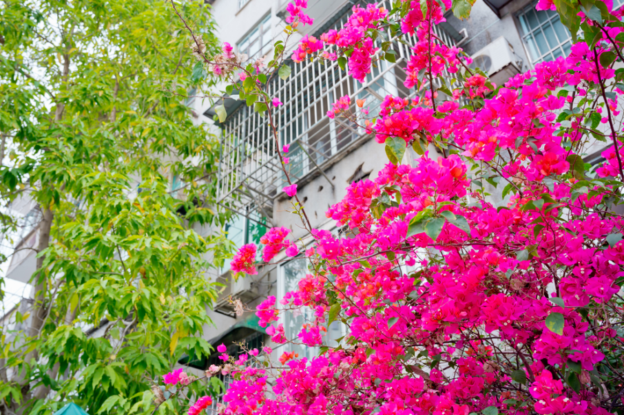在葛村路石油小区,三角梅如火燃烧照春晖。