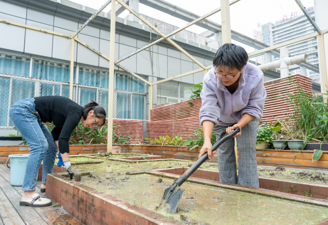 新竹社区居民志愿者正在“空中菜园”种植打理果蔬菜园。