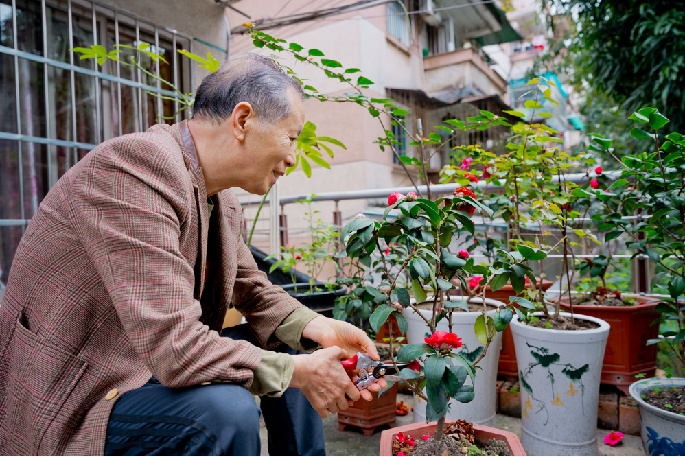 市民孔先生正在自家阳台给茶花修剪枝叶。